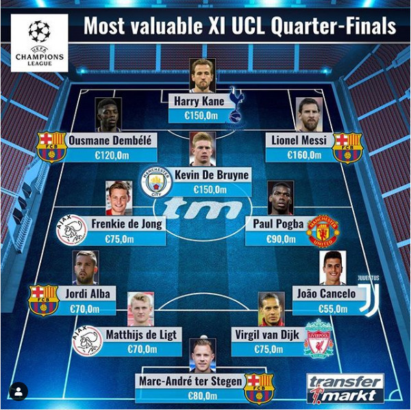 腾讯体育4月10日讯 今天凌晨,欧冠四分之一决赛首回合先赛两场,利物浦坐镇主场以2-0战胜波尔图,热刺则在新球场的欧冠首秀中以1-0力克曼城。《德转市场》统计了欧冠八强球队的最贵阵容,其中梅西领衔巴萨4将入选,中后卫则被荷兰国家队的中后卫搭档范迪克和德里赫特包揽,值得一提的是,意甲霸主尤文仅坎塞洛一人入选,C罗未能上榜。