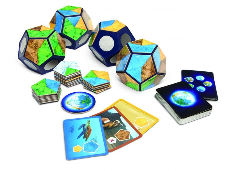 在游戏中,2 到 4 名玩家需要构建自己的独一无二的世界。跟传统的桌游不同,《我的星球》主要通过 4 个正十二面体,也就是星球核心来游玩,每个星球直径大约 10 厘米。拿在手上的手感舒适、结构牢实,随意摆弄不或是小心跌落在地上都没问题。星球核心的十二面都具有磁性,游戏中附带的 50 块地形板块能轻易吸附上去。随着游戏进行,你将一块块添加地形格,逐渐让你的世界成型,一步一步组建出星球上的山脉、森林、冰川还有沙漠。