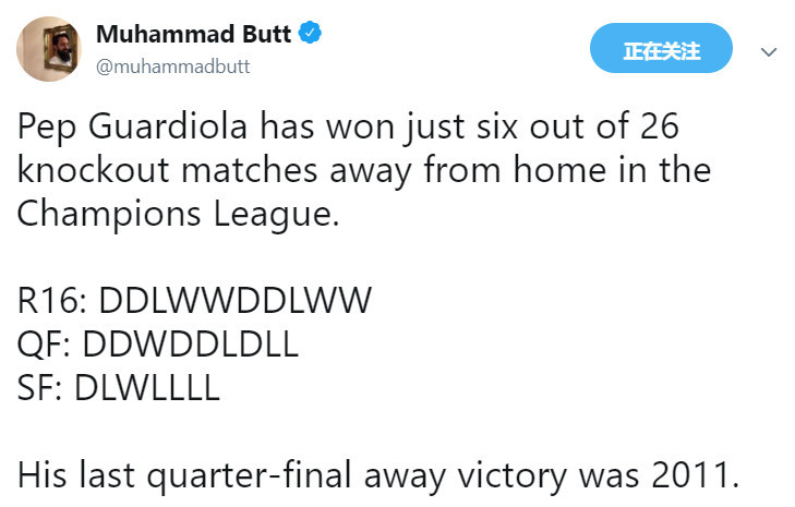 Squawka网站编辑Muhammad Butt对瓜帅欧冠淘汰赛阶段的客场执教战绩进行了统计,其中16强战为4胜4平2负,8强战为1胜5平3负,半决赛为1胜1平5负。而瓜迪奥拉上一次在欧冠1/4决赛中客场取胜,还要追溯到2011年。