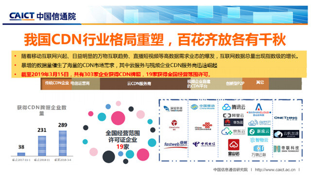 截止到2019年3月15日,共有303家企业获得CDN牌照,19家获得全国经营范围许可。胡海波特别指出:“CDN市场将近90%以上的企业属于非盈利状态,甚至有10%的企业是以其他业务收入补贴CDN市场的发展。”