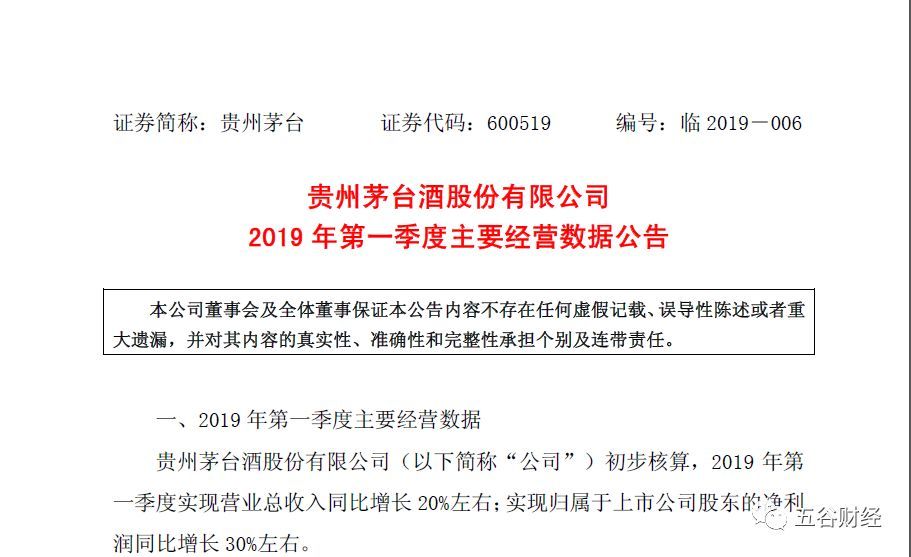 以贵州茅台为例,4月5日,其发布了2019年第一季度主要经营数据公告,经过初步核算,2019年第一季度,贵州茅台实现营业总收入同比增长20%左右;实现归属于上市公司股东的净利润同比增长30%左右。可见贵州茅台的净利增幅明显超过同期收入增幅!