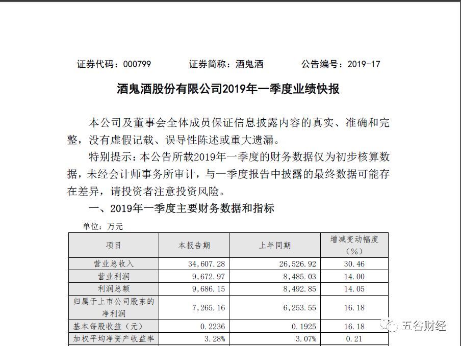 4月10日晚间,酒鬼酒发布了2019年一季度业绩快报,实现营业总收入约为3.46亿元,同比增幅在30%左右;
