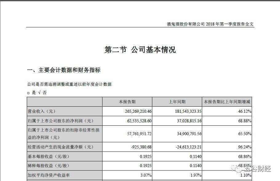公告显示,2018年一季度,酒鬼酒实现营业收入约为2.65亿元,同比增幅在46%左右;