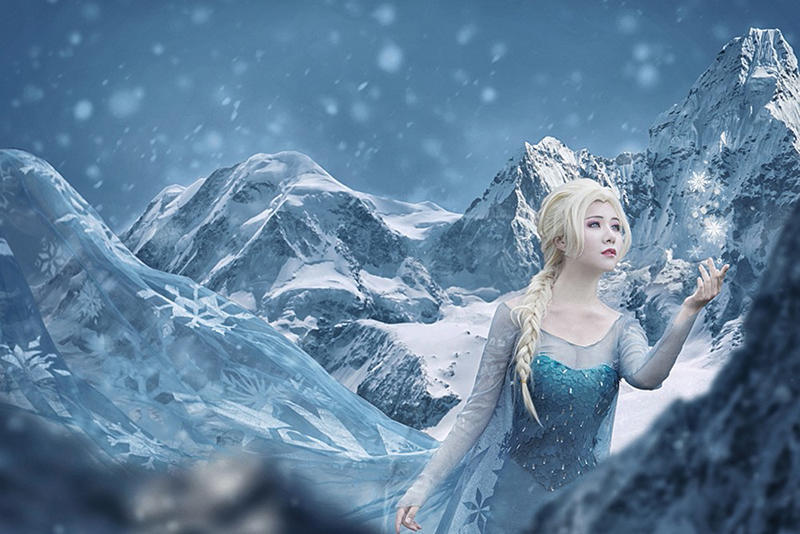 场景选择非常恢弘有气势,和人物本身十分契合,处理的也很自然,丰满了人物形象,给整体作品增色不少。但是在构图还有很大的进步空间,比如冰雪奇缘的整体景观的距离把控可以再优化一点,把景色拉远,效果更好。总的来说很不错。