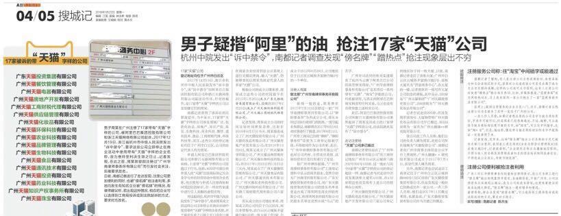 南都曾以《男子疑揩“阿里”的油 抢注17家“天猫”公司》对此进行报道。