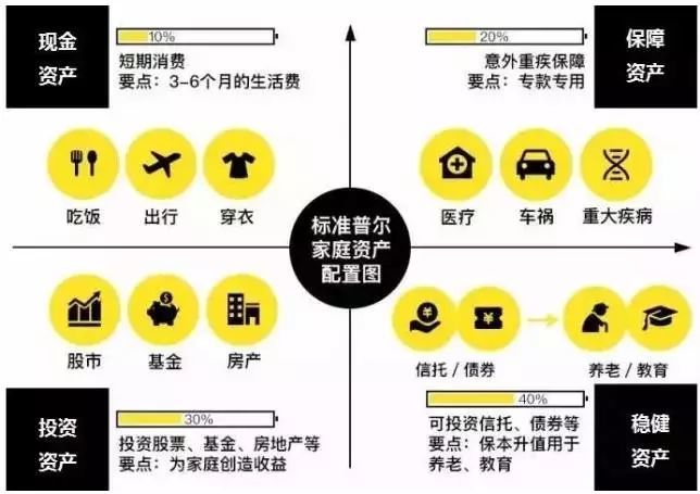 这个图是标准普尔(全球最具影响力的信用评级机构)调研全球十万个资产稳健增长的家庭,分析总结出他们的家庭理财方式,是世界上公认的最科学、稳健的资产分配方式。
