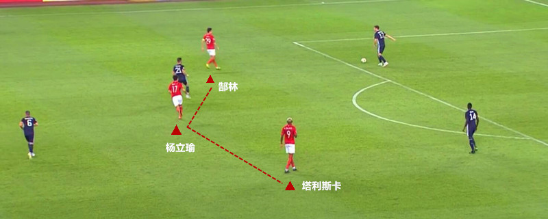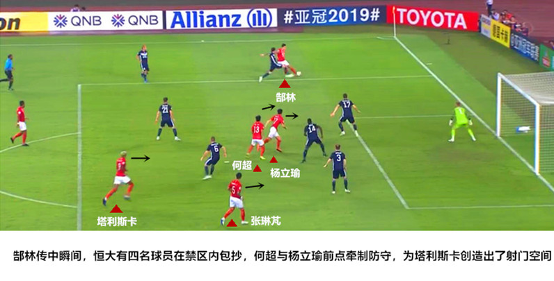 塔利斯卡在比赛第6分钟的进球,则是恒大前场能力最好的展现。这粒进球既是塔利斯卡攻入的,也来自于他的策划。首先塔利斯卡精准长传给左路前插的郜林,随后自己快速冲向禁区。而郜林在两人包夹下完成了传中,塔利斯卡在何超、杨立瑜两名球员掩护下完成了攻门。这粒进球,也帮助广州恒大收获了完美的开局。