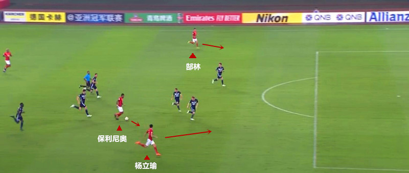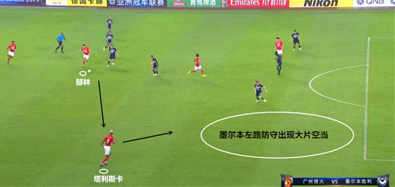 首先塔利斯卡大局观出色,他从强侧向弱侧的调度决定恒大进攻线路。其次是保利尼奥的后插上,使恒大在前场增加了一个支点,在某种程度上也弥补了中锋杨立瑜推进与有球能力的不足。最后则是郜林在边路的传中以及护球和做球,与两位外援配合非常默契。郜林频繁策应塔利斯卡前插,也使得墨尔本胜利左路防守逐渐被打穿。前场三人相互之间不断的连线,也极大影响恒大的上限。