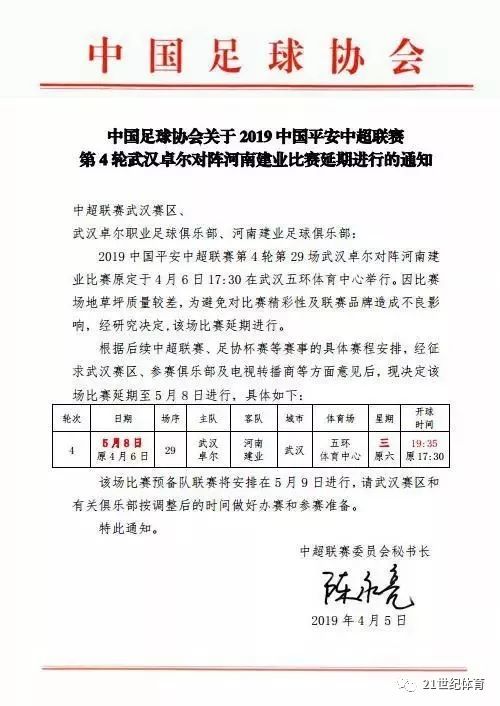 4月10日,终于在被延期的中超第四轮武汉卓尔VS河南建业比赛之前,中国足协表达了对赛事延期的歉意,同时表示批评武汉赛区,后续将专项督查各赛区的草坪质量。