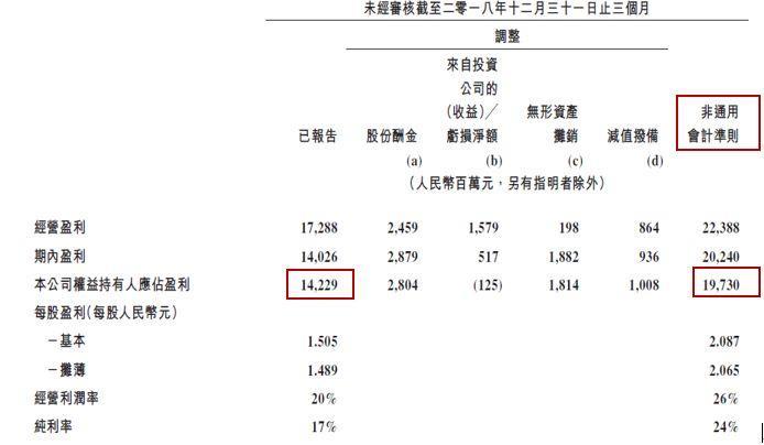 而腾讯在第四季度报告中,披露的非通用准则下归属于股东的净利,是剔除了员工股份期权、投资公司利得损失、投资产生的无形资产摊销费用以及减值损失这些非日常经营相关项目后,得出的体现实际经营盈利能力的利润。