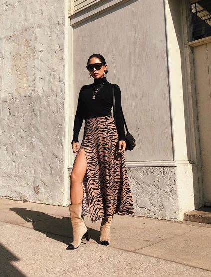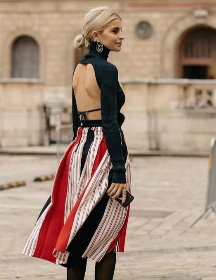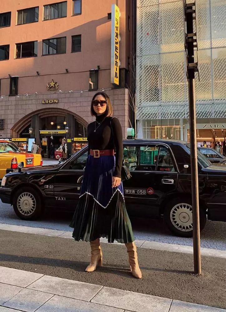 这样一看,高领贴身针织衫完全是半裙的最完美搭配,Aimee Song搭配半裙最爱它,不光腰部曲线,并且还增添些许优雅。