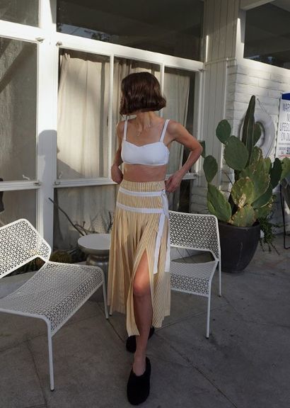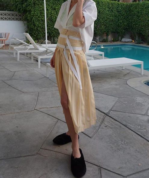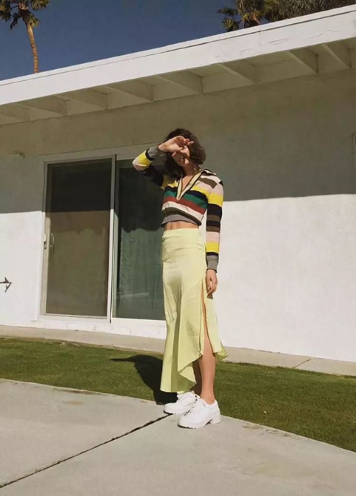 柠檬黄丝绸裙搭配短款彩虹条上衣,活泼少女风。