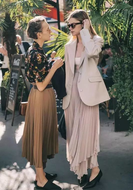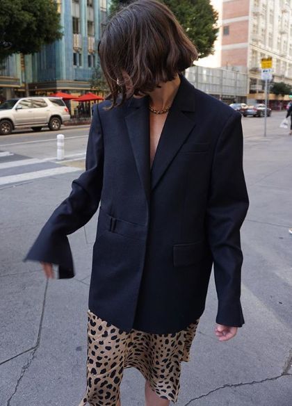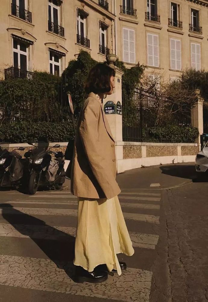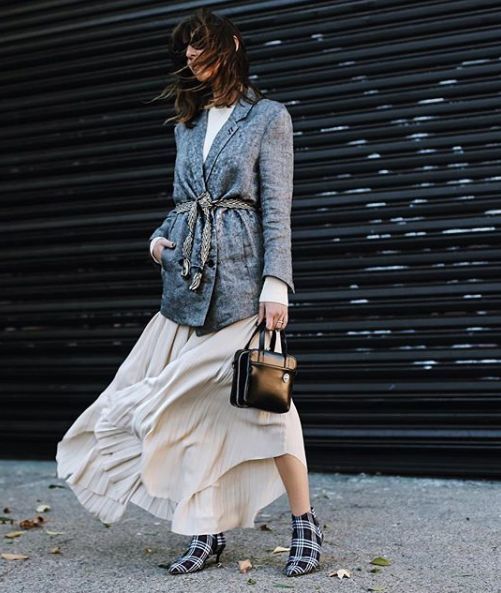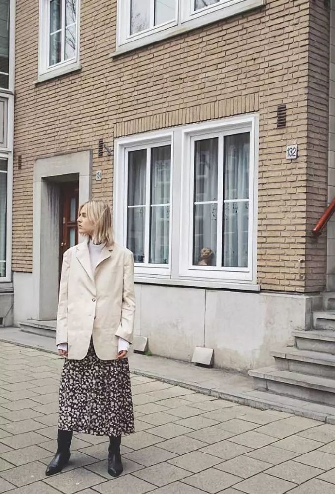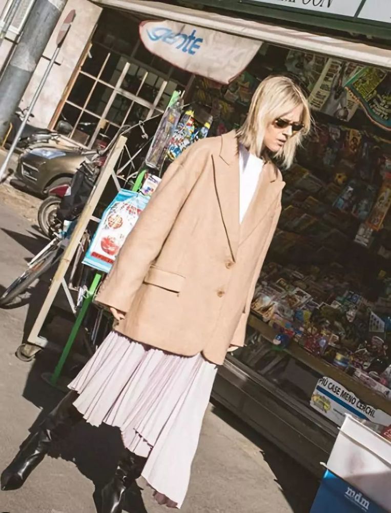 稍微紧身西装外套搭配半身裙已经过时了。2019秋冬街拍中出现的最多就是oversize西装搭配半身裙。