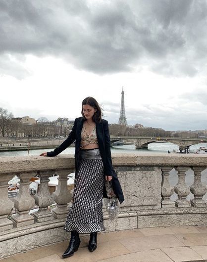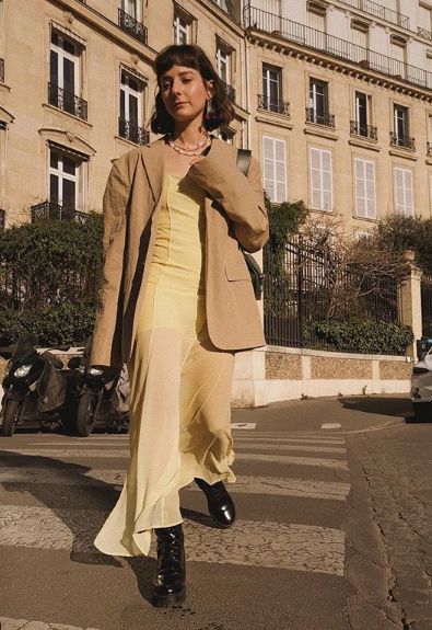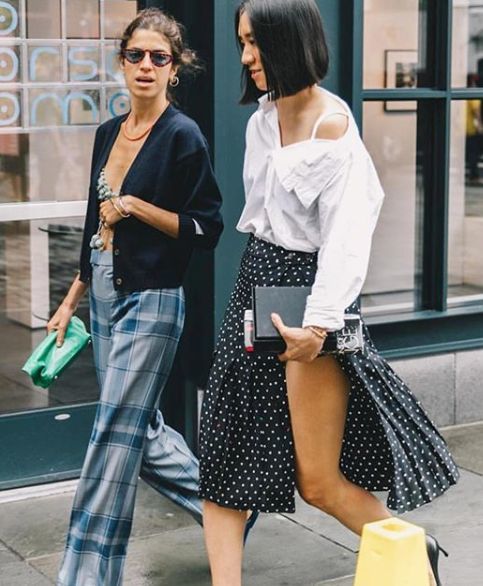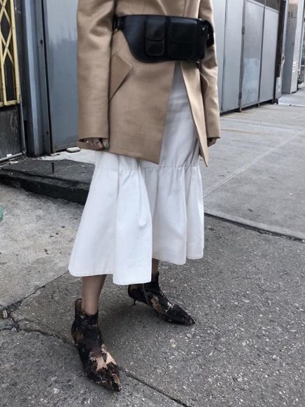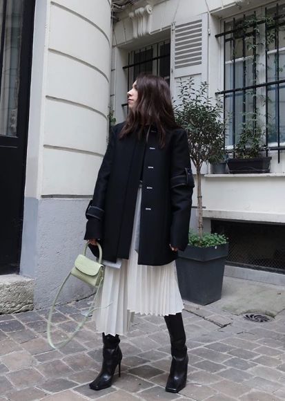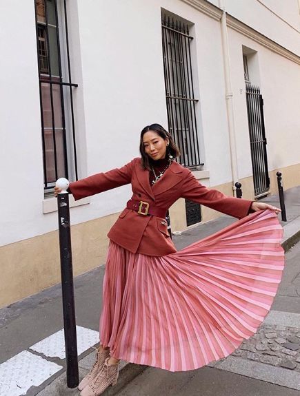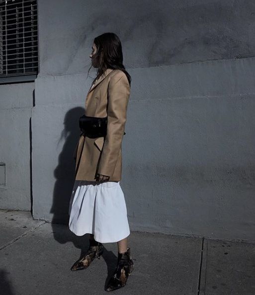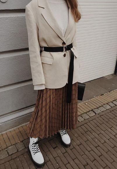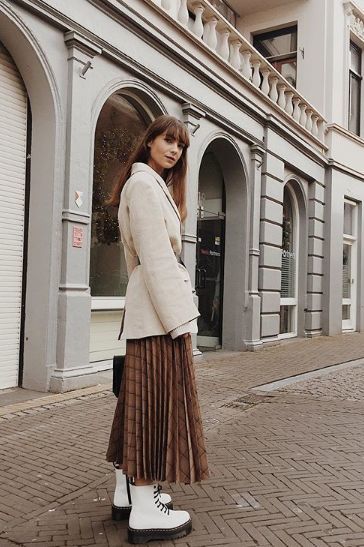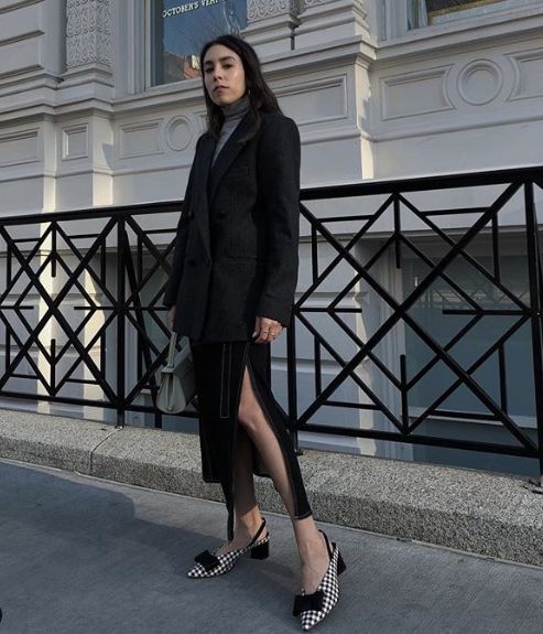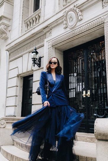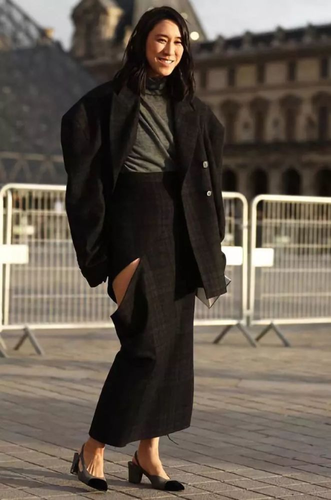 稍微紧身西装外套搭配半身裙已经过时了。2019秋冬街拍中出现的最多就是oversize西装搭配半身裙。