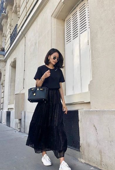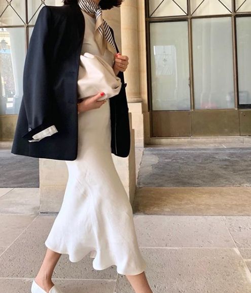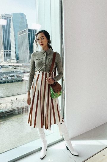 Chriselle Lim半身裙搭配贴身衬衫,适合稍微正式的场合。