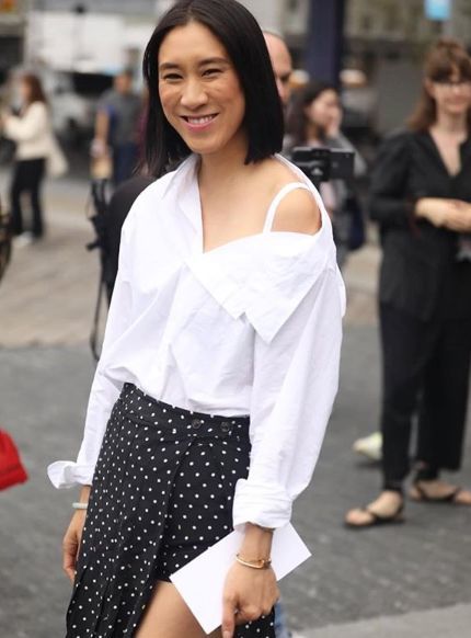 要说扛把子肯定是百搭色白色咯,即使搭配基础款,白衬衫都可以完美hold住,像博主Eva Chen小露香肩,微微透露一丝丝妩媚。