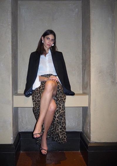 这件衬衫成为Marta Cygan搭配裙装秘密武器,搭配Realisation Par的丝质豹纹裙,一看就很贵。