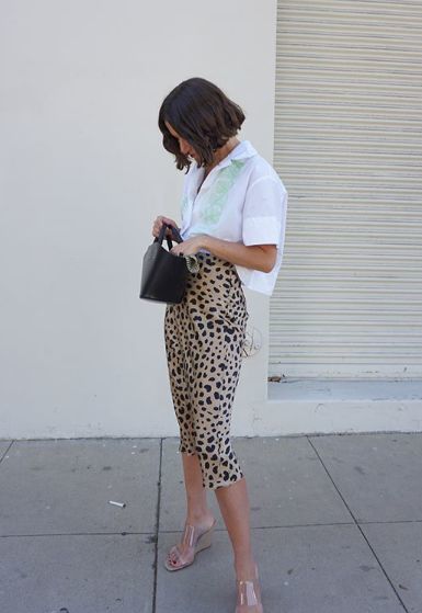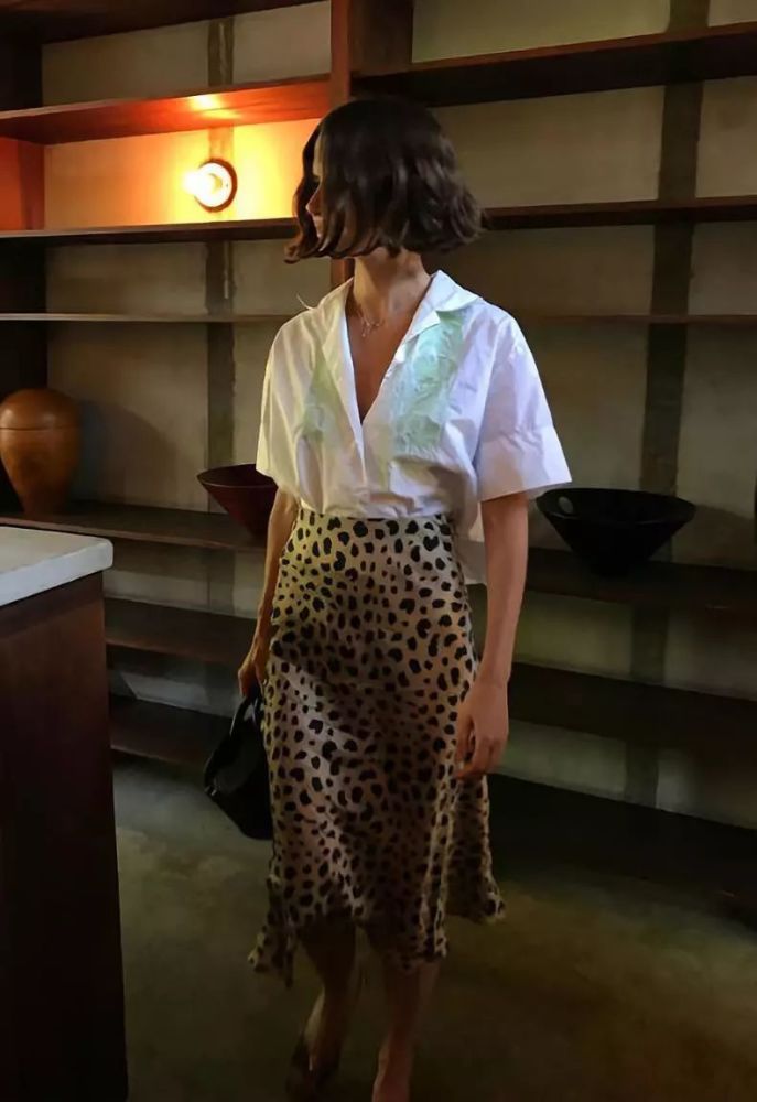 白衬衫也可以穿的像霸道总裁,即使豹纹很狂野,白色衬衫也完美让裙子升级。