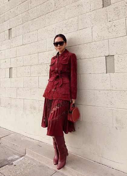只要凸显腰线,同色系也完全没问题。不同材质搭配,一点都不沉闷。