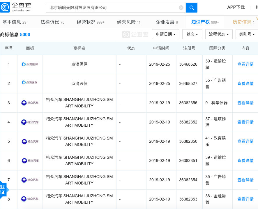 企查查数据显示:近日,滴滴金融服务上线“全桔”系统。“全桔”的运营主体是北京嘀嘀无限科技发展有限公司,其法定代表人程维。该公司相关商标信息5千条,包括“点滴医保”、“桔众”、“小桔优品”等商标。...