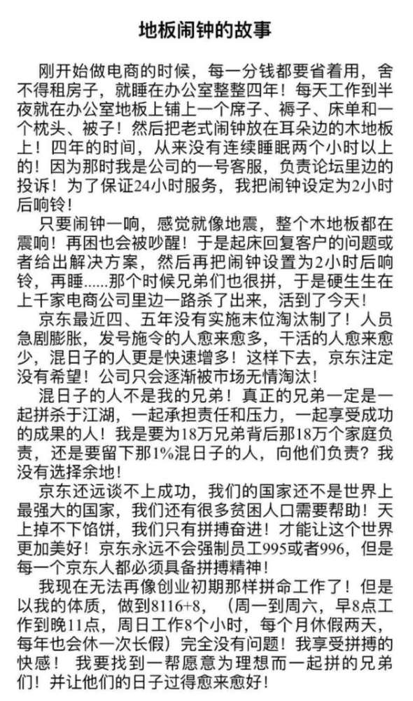 同时他表示,京东还远谈不上成功。京东永远不会强制员工995或者996,但是每一个京东人都必须具备拼搏精神!我现在无法再像创业初期那样拼命工作了!但是以我的体质,做到811648,(周一到周六,早8点工作到晚11点,周日工作8个小时,每个月休假两天,每年也会休一次长假)完全没有问题!我享受拼搏的快感!我要找到一帮愿意为理想而一起拼的兄弟们。