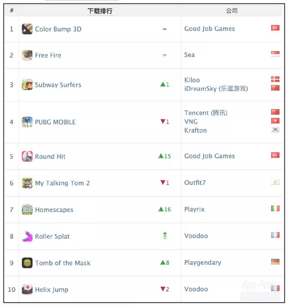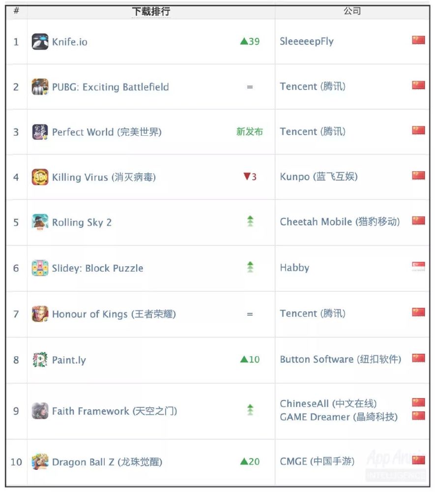 放眼全球iOS&Google Play榜单,不难发现全球手游市场也有了一些新的变化:在下载榜方面,Voodoo的新作《Roller Splat》拿下第8名;收入榜中,腾讯《PUBG Mobile》取得第9名的历史新高成绩,此外《完美世界》手游一经推出便在全球收入榜上位居第4名。