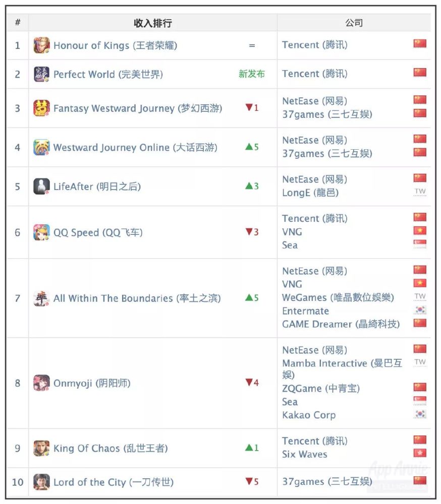 国内收入榜方面,《王者荣耀》依然高居榜首,而最显著的变化自然是《完美世界》手游,该作首次登榜就已来到第3名的位置。值得一提的是,《完美世界》手游正式上线几天后,一度打破了《王者荣耀》自去年12月29日开始,持续69天的畅销榜冠军位纪录。