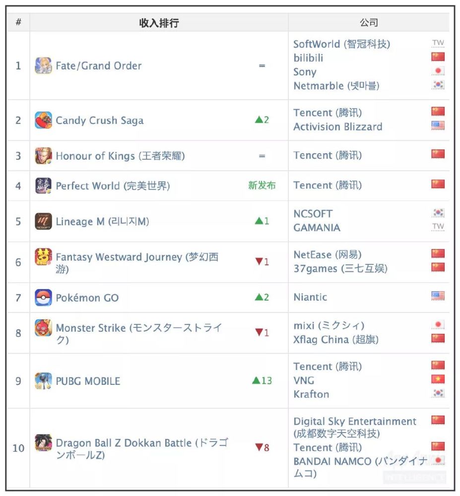 全球收入榜中,《FGO》稳坐冠军位,名次没有变化的还包括位居第3的《王者荣耀》。《完美世界》手游的排名第4的成绩不再多做说明,另一款腾讯发行的游戏《PUBG MOBILE》表现出明显的上升趋势,本月在全球iOS&GooglePlay手游收入榜的排名上升了13位,成功拿下第9名。