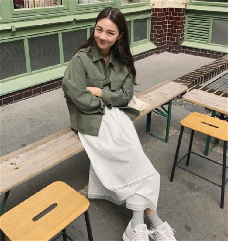 军绿色的牛仔外套,给人一种很精气神的感觉,色彩运用的很大胆,轻松增添一抹春日别样色彩。但是想要很好的缓解这种浓厚的色彩,那么小仙女就要好好的学会用白色半身裙,来减轻这种感觉了,因为白色是属于无色系,那么深浅对比色,就会产生强烈的视觉冲击感。