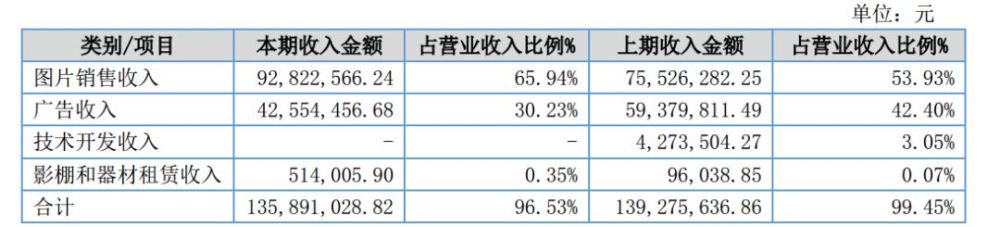 2017年,全景网络营收1.36亿元,其中,图片销售收入0.93亿元,同比增长28.06%;广告收入0.43亿元,同比减少28.34%;影棚和器材租赁收入0.0514亿元。