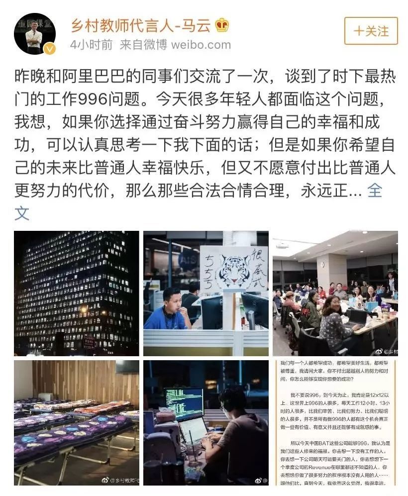 “今天中国BAT这些公司能够996,我认为是我们这些人修来的福报。”“如果你年轻的时候不996,你什么时候可以996?”马云在交流中对阿里的员工们说。“这个世界上,我们每一个人都希望成功,都希望美好生活,都希望被尊重,我请问大家,你不付出超越别人的努力和时间,你怎么能够实现你想要的成功?”