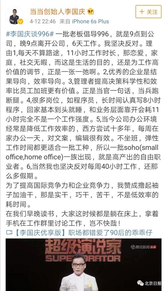 针对996的话题,昨夜,当当创始人李国庆也阐明了自己的观点和态度:一批老板倡导996,就是9点到公司,晚9点离开公司,6天工作。我坚决反对。