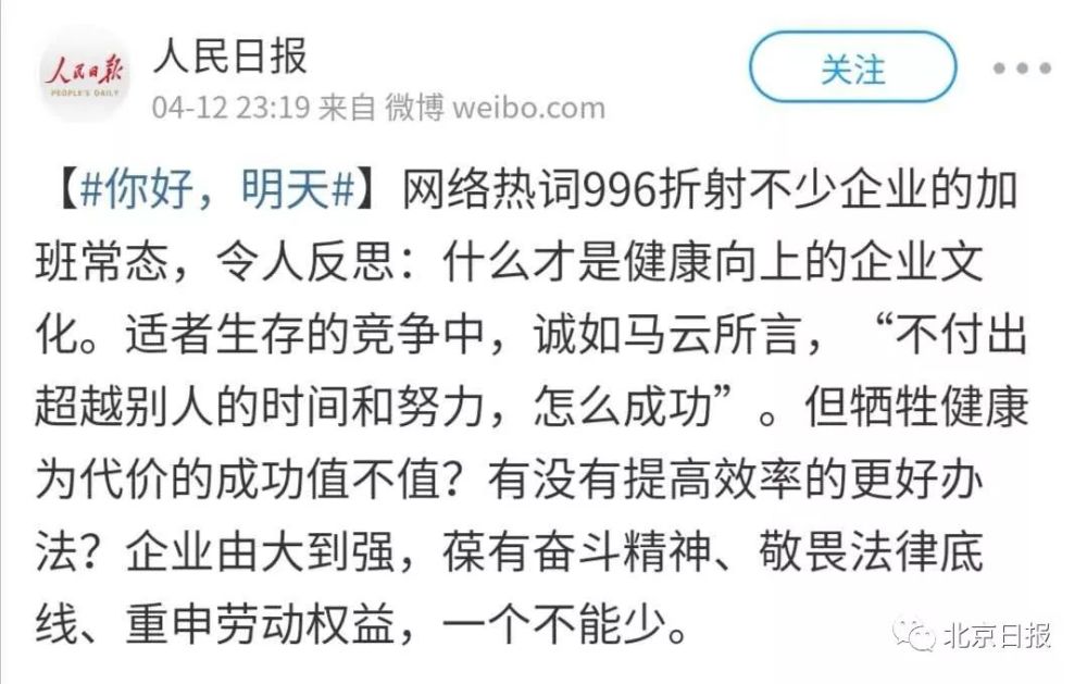 人民日报甚至发表微评表示,网络热词996折射不少企业的加班常态,令人反思:什么才是健康向上的企业文化。适者生存的竞争中,诚如马云所言,“不付出超越别人的时间和努力,怎么成功”。但牺牲健康为代价的成功值不值?有没有提高效率的更好办法?企业由大到强,葆有奋斗精神、敬畏法律底线、重申劳动权益,一个不能少。