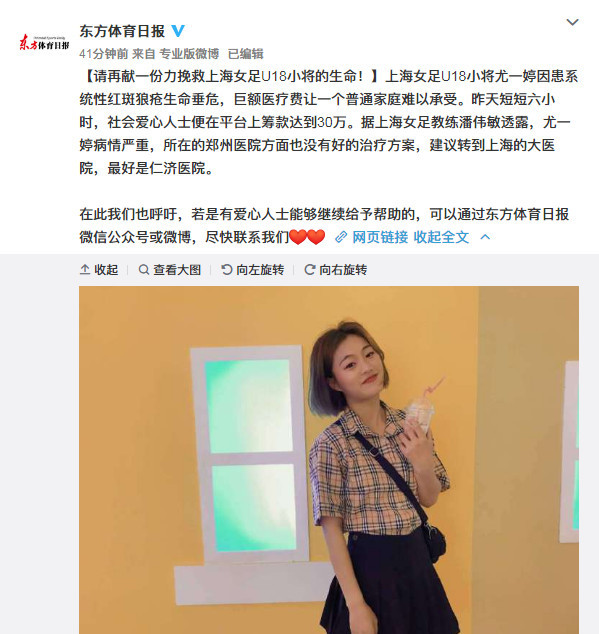 上海女足教练潘伟敏写道:“各位亲爱的朋友,不久前我们队伍的一名队员尤一婷突发系统性红斑狼疮,生命垂危,18岁的花季女孩面临生死考验,家里为了孩子也竭尽全力的进行救助,可是巨额的医疗费也压的这个普通家庭难以承受,希望各位好心人能够献出一点爱心,不要让这个年轻的生命凋零!恳请各位好心人士伸手相助,多多转发,您的每一次转发对我们都至关重要,每一次转发对我们来说都是莫大的帮助!”
