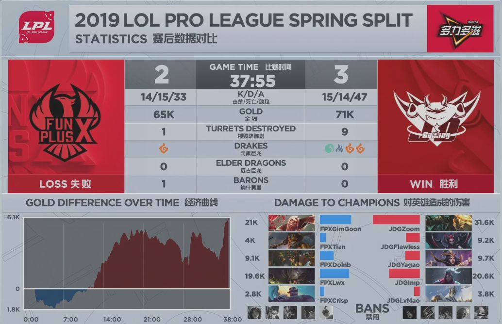 在刚结束的LPL 2019春季赛季后赛第三轮的比赛中,JDG 3-2战胜FPX,成功挺进季后赛决赛。以下为比赛详情: