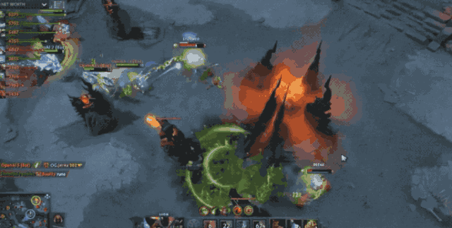 比赛开始后,开局抢钱,OpenAI Five 拿下一血。而后双方在战线阶段,双方打的势均力敌,经济与人头数一度拉平。不久之后,OG 河道一波失误,导致丢失中路二塔与高地。