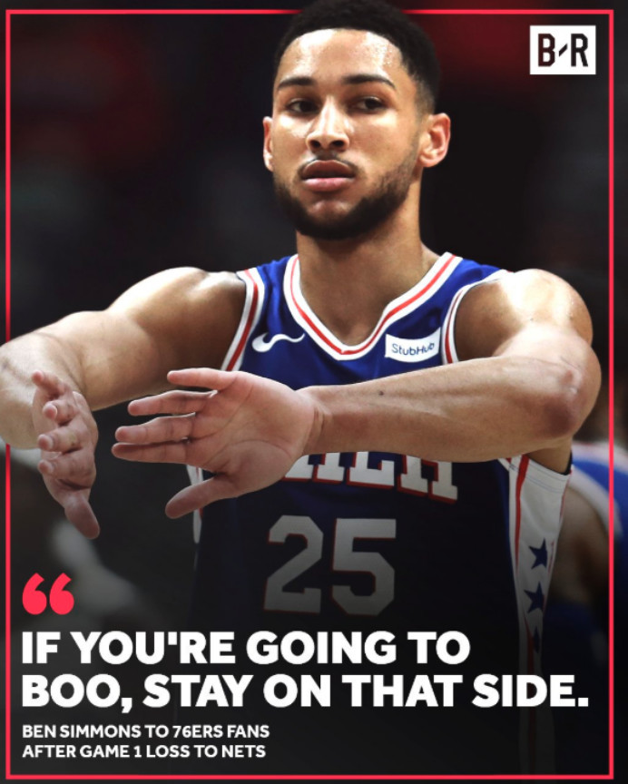 打得不好,被球迷嘘,这也很正常。就和巴特勒赛后说的那样,赢球,球迷们就不会嘘了。但这个时候,西蒙斯的这个小情商就有点感人了,赛后西蒙斯怒怼球迷,“如果你是76人球迷,还要嘘(我),去另一边吧(篮网)。”