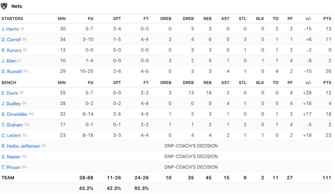 当然,篮网和魔术能够客场取胜,不仅仅是因为拉塞尔和奥古斯丁表现,更因为他们拥有一个状态更好,互相扶持的团队。这张数据图或许可以更清晰的显示出来,篮网的轮换阵容,才是他们赢球的真正原因所在。