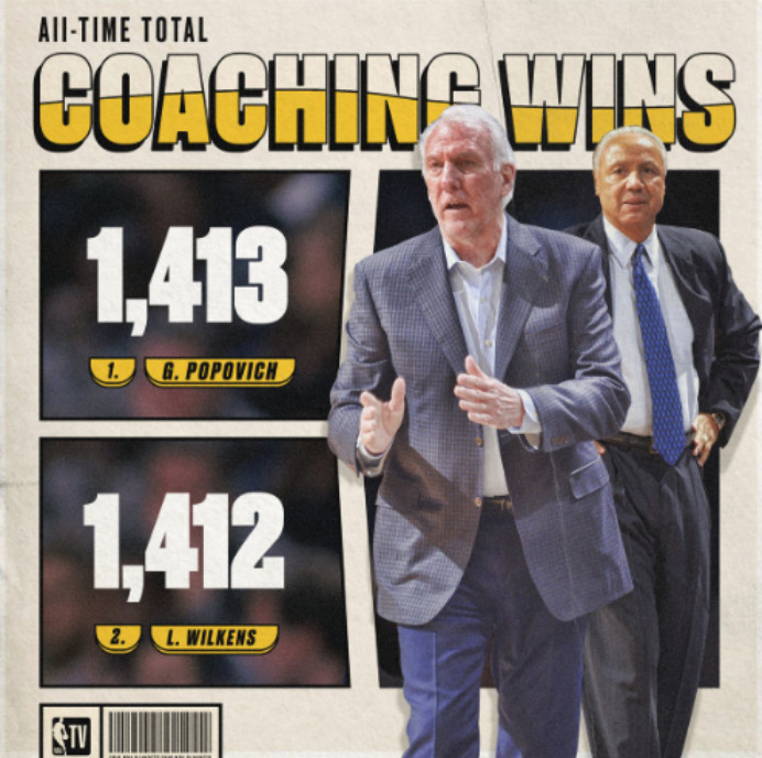 这场比赛的胜利,让马刺主帅波波维奇常规赛和季后赛的总胜场数达到了1413场,超越兰尼-威尔肯斯,排名NBA的历史第一位。即便实力不如掘金又如何,波波维奇仍然可以将他们玩弄于掌骨之间。