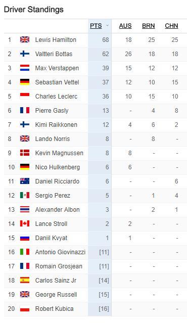 在目前的车手积分榜上,汉密尔顿以68分排名榜首,队友博塔斯以62分排名第二,维斯塔潘以39分排名第三,维特尔以2分之差排名第四。