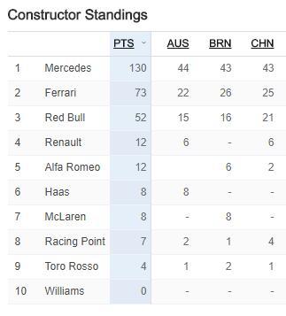 而在车队积分榜上,连续三站比赛包揽冠亚军的梅赛德斯车队以130分排名榜首,法拉利车队以73分排名第二,红牛车队以52分排名第三。(李田友)