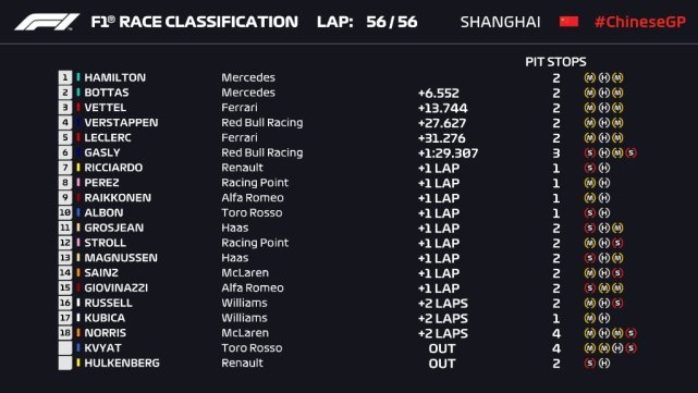 汉密尔顿没有遭遇到任何挑战,他率先冲过终点拿下本站比赛的冠军,博塔斯获得第二名,梅赛德斯连续三站比赛包揽冠亚军。维特尔获得第三名,接下来依次是维斯塔潘和勒克莱尔,加斯利最后时刻抢走了最快单圈。