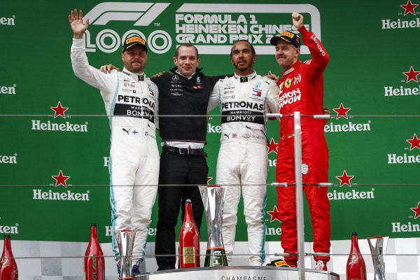腾讯体育讯 北京时间4月14日消息,2019赛季F1中国站今日进行了正赛的争夺。梅赛德斯车队的汉密尔顿发车时超越队友,最终率先冲过终点获得冠军,博塔斯获得第二名,梅赛德斯连续三站比赛包揽冠亚军。维特尔获得第三名,接下来依次是维斯塔潘和勒克莱尔。