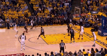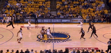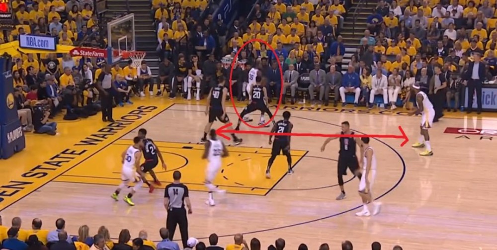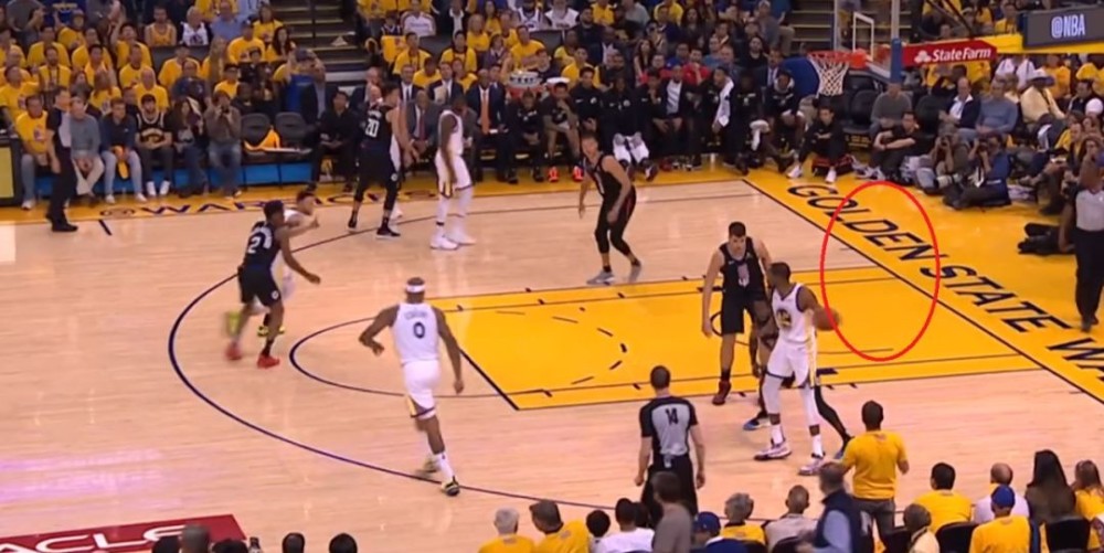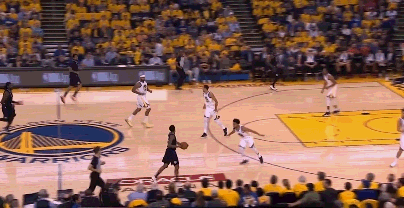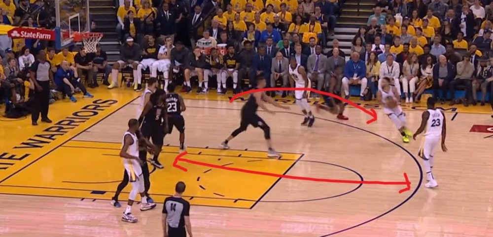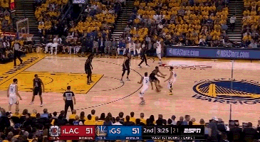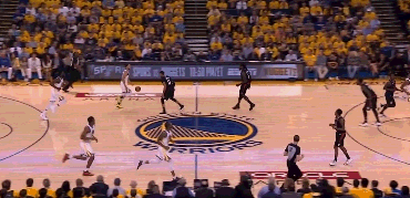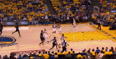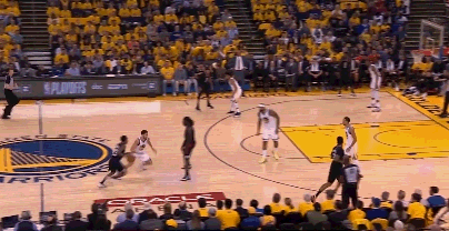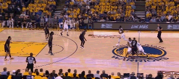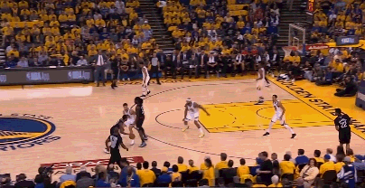 我们来看看这样的回合——就像我之前说的,库里可能在进攻还有17~18秒时,就可以完成一次挡拆回合了,如果他刚过半场就挡拆了,那防守方可能还没从退防找人的状态中回过神来: