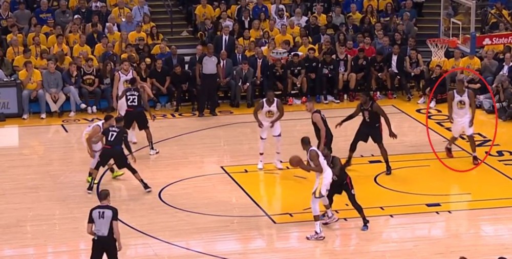 这可能就是好习惯与坏习惯造成的结果,快船可以应对那些里弗斯强调的、比较容易执行的策略,比如放掉考辛斯,放掉格林,回收篮下,夹击低位持球的杜兰特,但这种动态环境下需要迅速阅读比赛的回合,库里太熟悉了,快船则有点发懵。比如下面这个回合,他们完全可以夹击库里——哈雷尔已经放掉了格林,即使夹击库里漏掉伊戈达拉,快船篮下的协防人数还是足够。