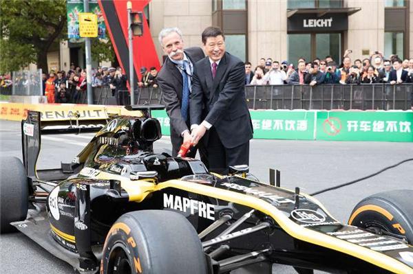 4月13日中午,F1赛车亮相上海市中心,切斯·凯里与上海市市长应勇一起为赛车加油