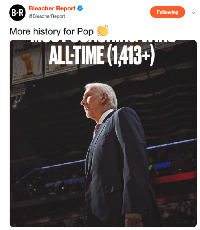 马刺战胜了掘金,这场比赛是老爷子波波维奇执教生涯的第1413场胜利(常规赛+季后赛)。这也让他超越了兰尼-威尔肯斯独占NBA的第一位,波波维奇一个人的胜场数,就超过了联盟很多球队。