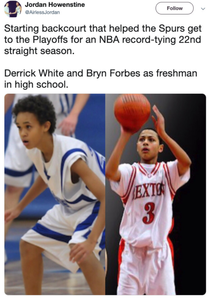 波波维奇总是有一种力量,那就是化腐朽为神奇,很多联盟的边缘人物,到了波波维奇的手下,总是可以成为关键先生。今天对阵掘金的比赛中,福布斯全场9投6中,得到了15分,而德里克-怀特10投7中,得到了16分5助攻,比赛的最关键时刻,两人都有着非常出色的表现。而今天在社交媒体上,有记者晒出了一张两人童年时期的照片。
