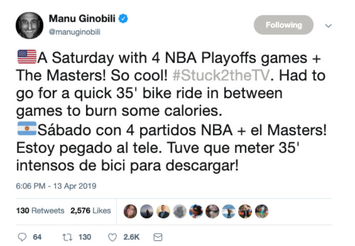 本来球衣退役之后,马刺球星吉诺比利已经正式开启了退役生活。但季后赛如此精彩,让吉诺比利驻足于电视机前。在社交媒体上,吉诺比利就写道,“周六(当地时间)有4场季后赛还有大师赛,太酷了。我不得不在比赛间隙骑动感单车,燃烧一些卡路里。”