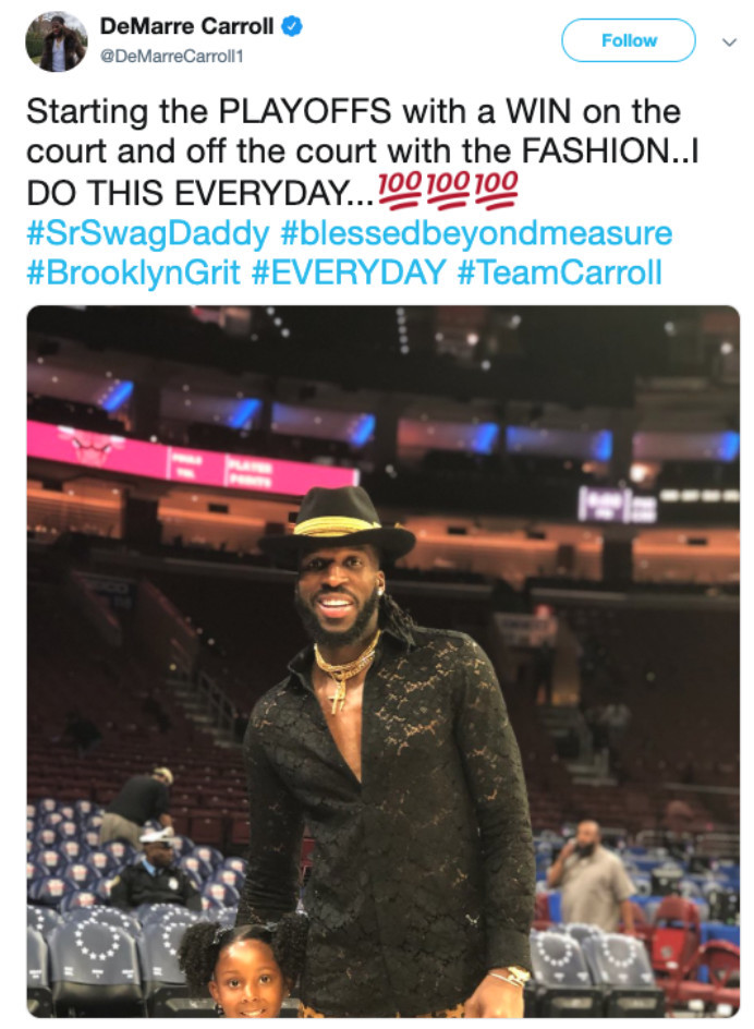 篮网战胜76人,这场比赛中,卡罗尔得到了11分6篮板。球队取胜,卡罗尔晒出了一张自己的照片,然后写道,“在球场上,以一场胜利开启季后赛,在场下保持着时尚,我每一天都在这样去做。”